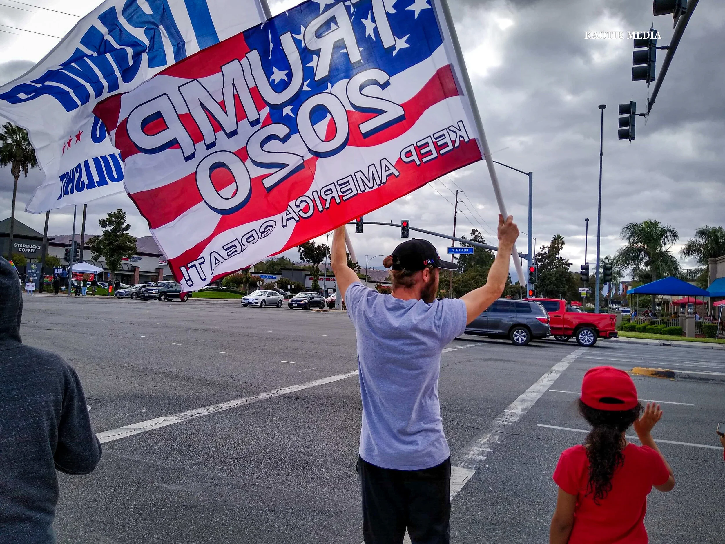 A man holds Trump 2020 flags at a pro-Trump rally while anti-Trump protestors demonstrate across the street in Riverside, California.